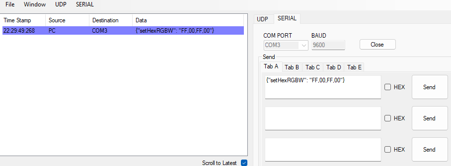 Download the application below, and when you run it, simply set the COM port of the light in the settings, and voila! You've got control.